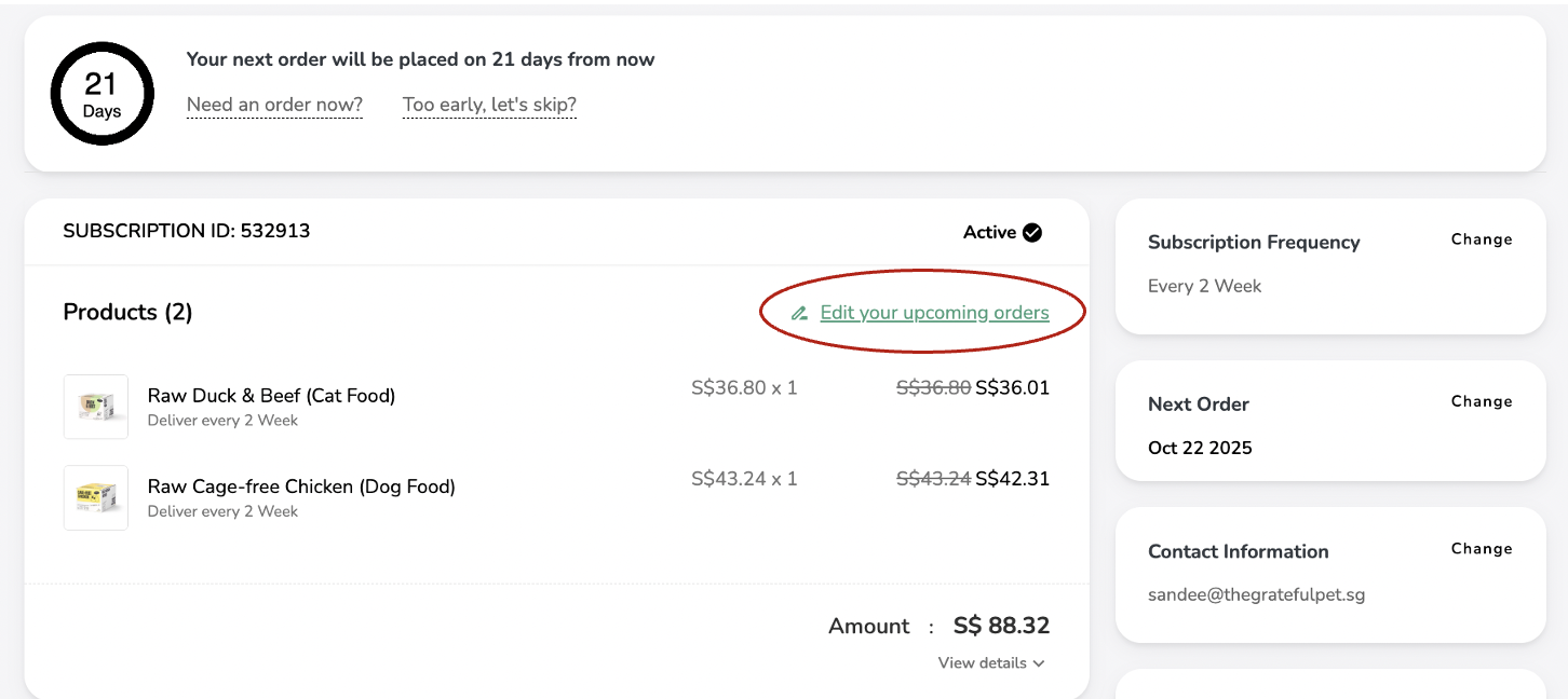Step 4: Next click on ‘Edit your upcoming orders’. From there, you will be able to adjust the quantities of items for your subscription by clicking the (+) or (-) buttons. Please note that any changes made will only be applicable to the delivery taking place for your next bill.