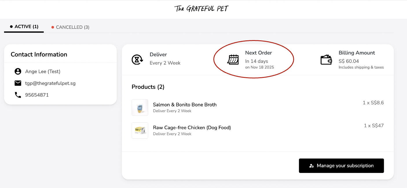 Alternatively, you can also click on ‘Manage your subscription’. Your next billing date will appear under ‘Next order’.